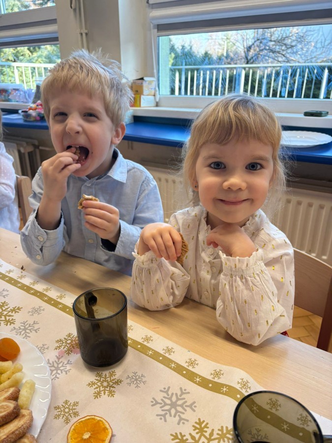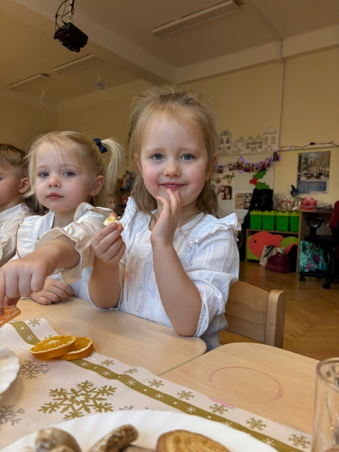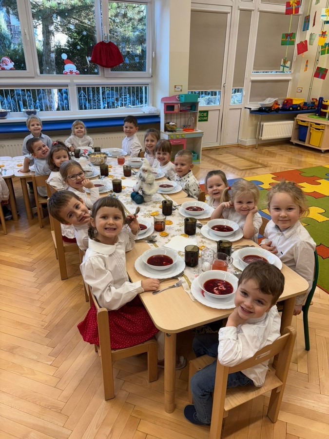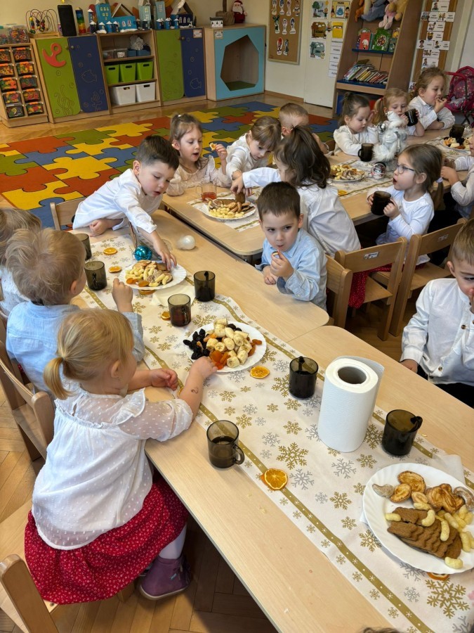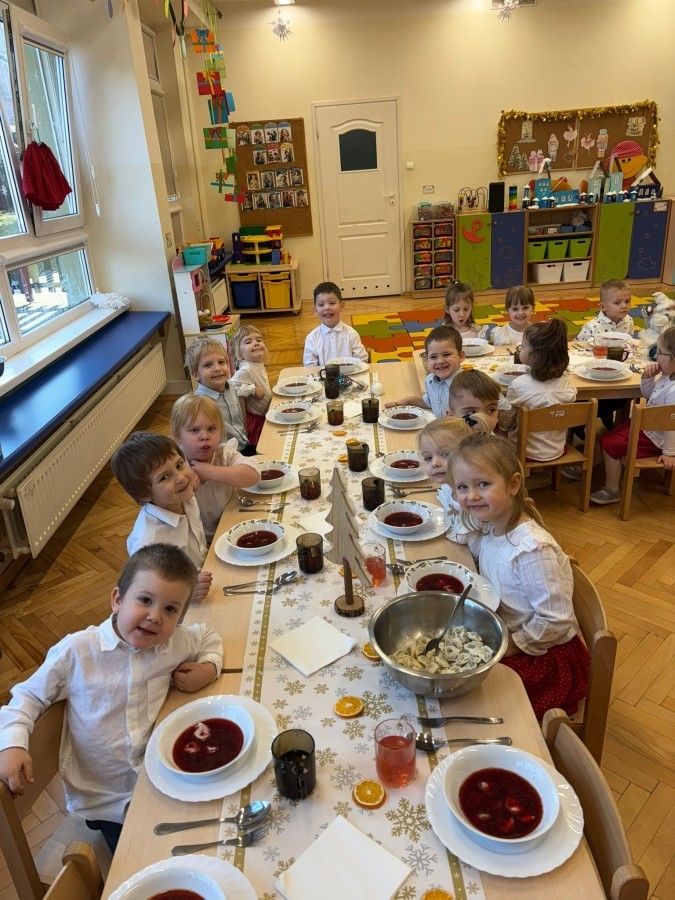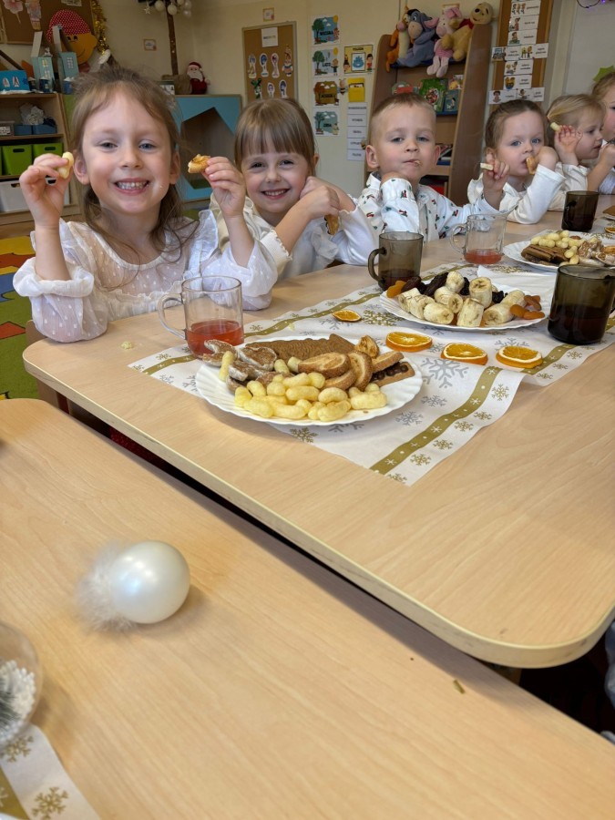 W grupie "Pszczółki" odbyła się uroczysta, grupowa wigilia. Dzieci w świątecznej atmosferze składały sobie serdeczne życzenia, dzieliły się opłatkiem oraz wspólnie świętowały przy wigilijnym stole. Spotkanie było pełne radości, ciepła i wzajemnej życzliwości, a wspólne chwile sprzyjały integracji oraz kultywowaniu świątecznych tradycji. 🎄✨
