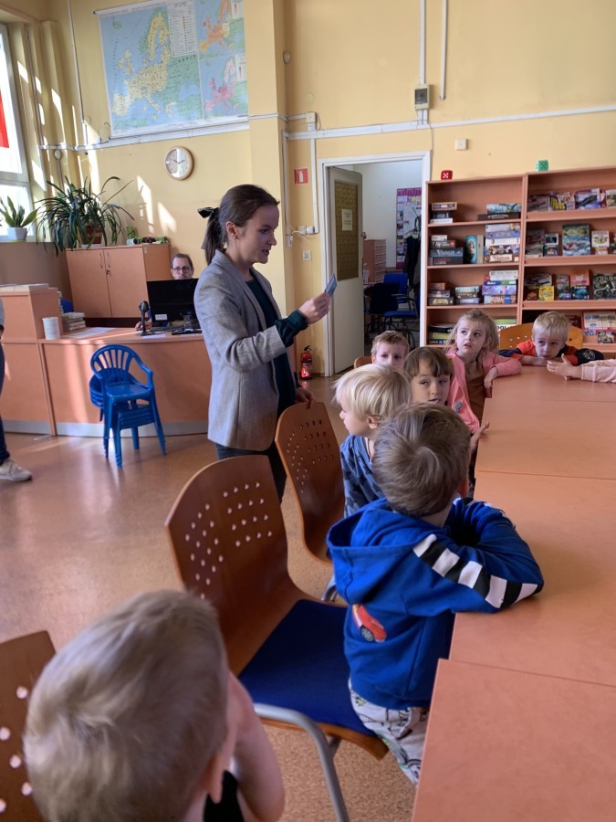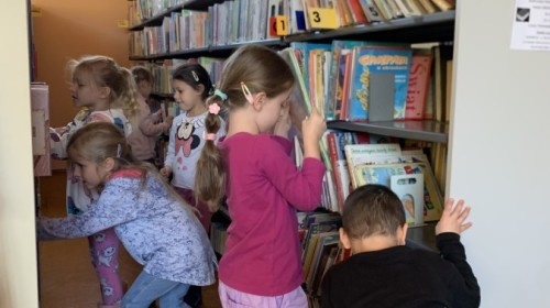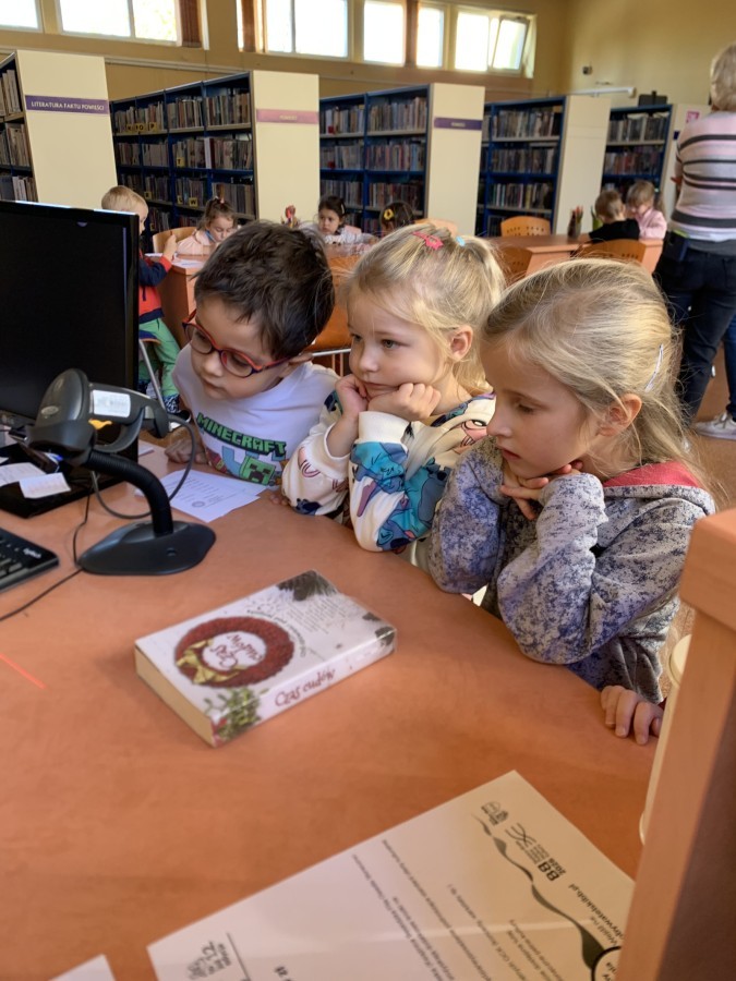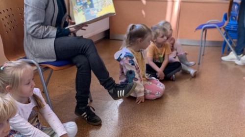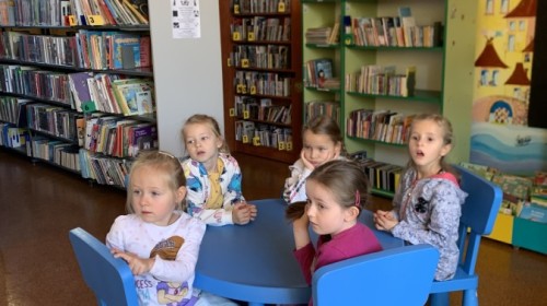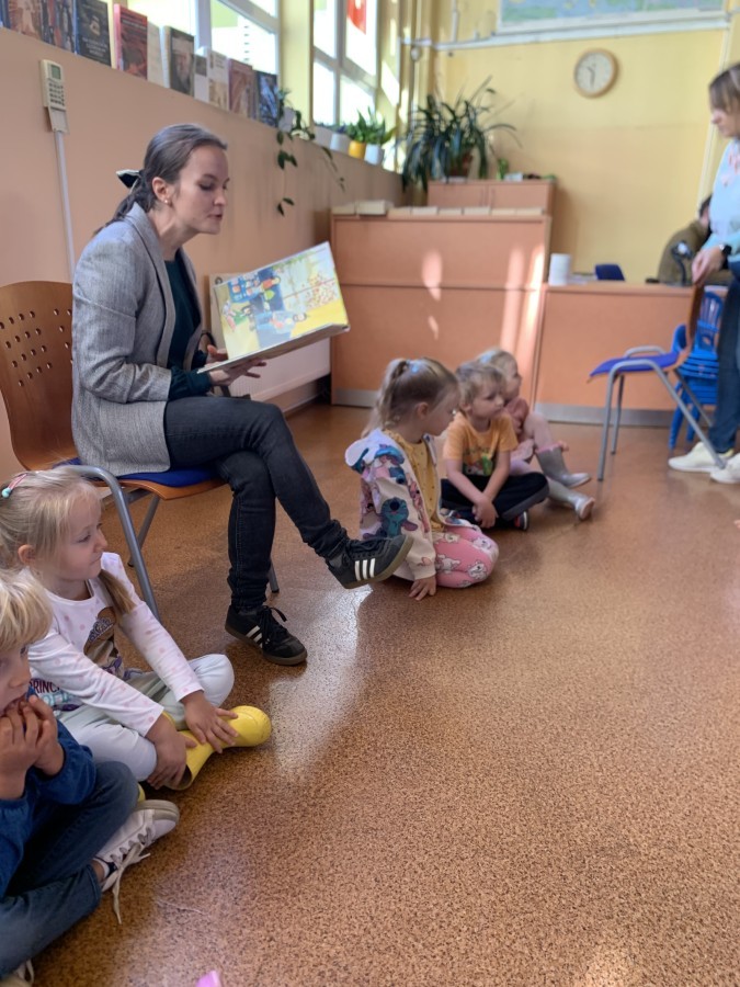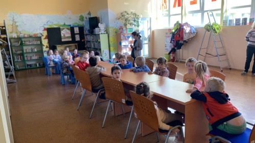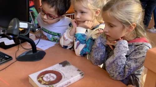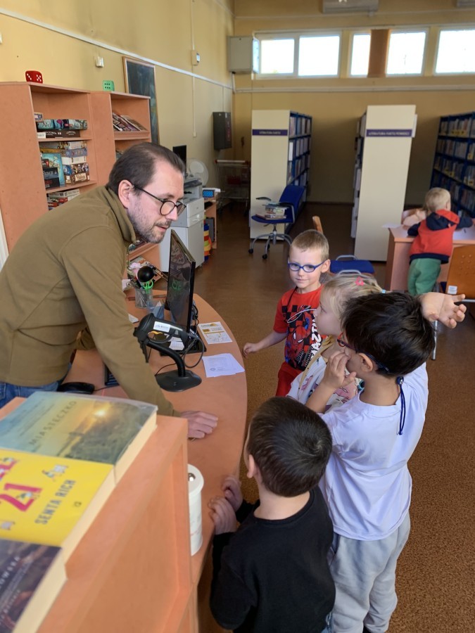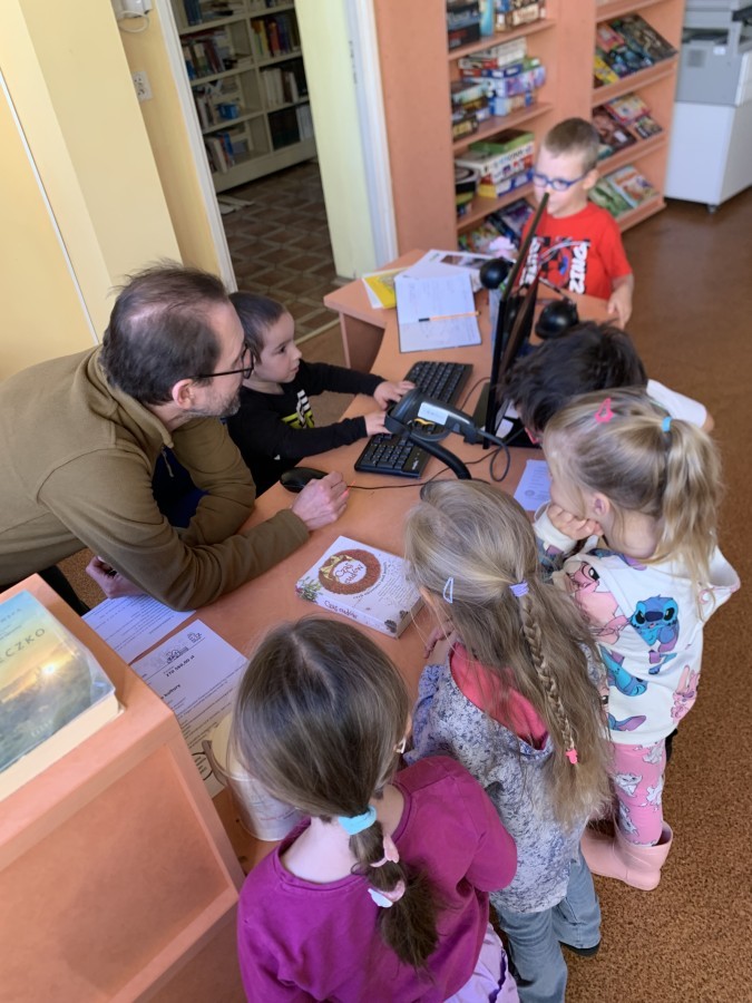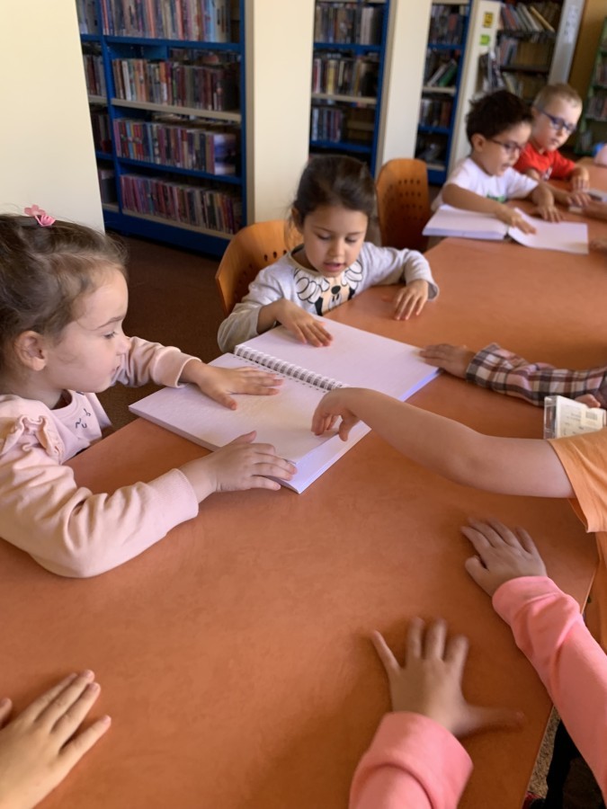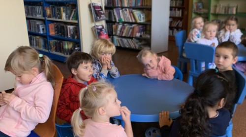 Przedszkolaki miały także okazję zaprojektować własną pieczątkę biblioteczną, tworząc ciekawe i oryginalne wzory. Wysłuchały również czytanej książki oraz wzięły udział w zabawie w „czytelników”, poznając w praktyce zasady korzystania z biblioteki.