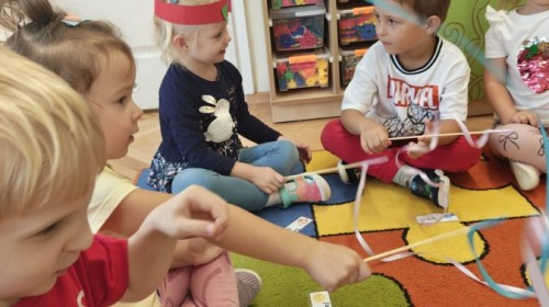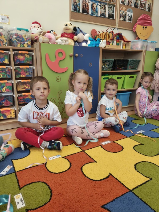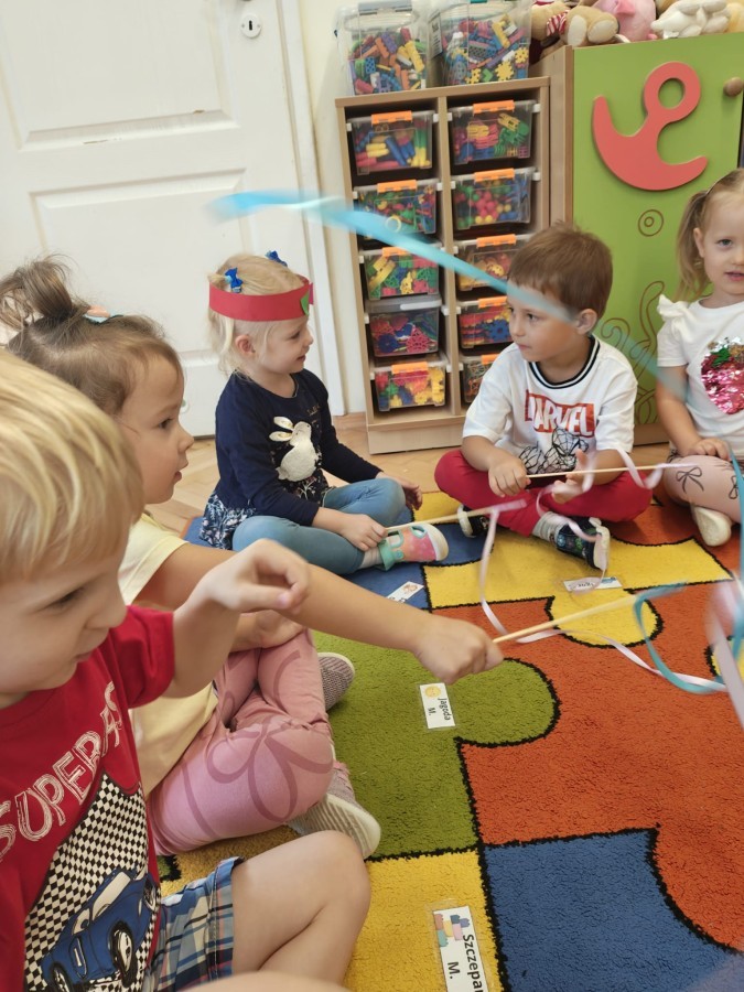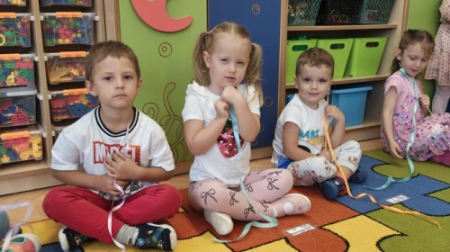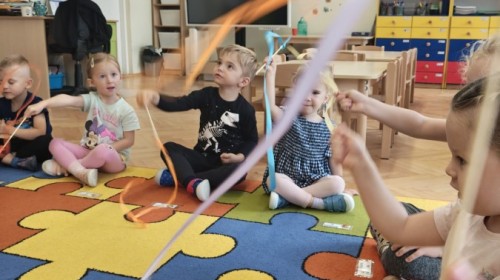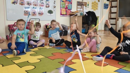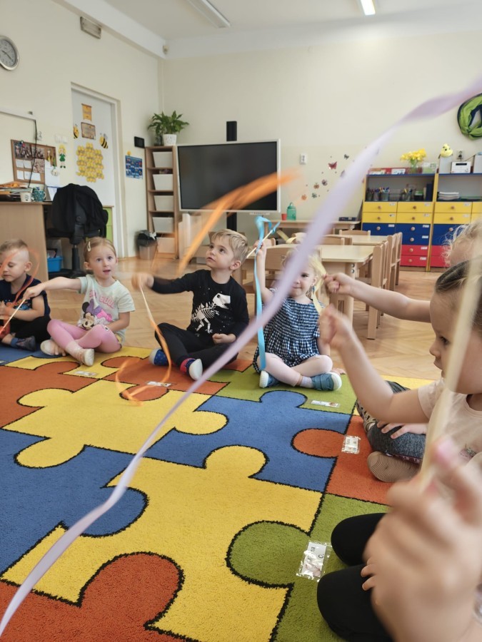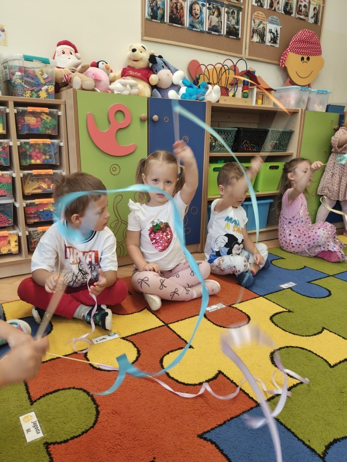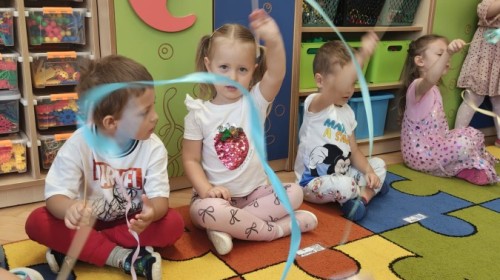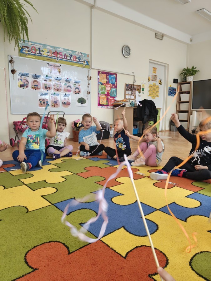 W grupie "Pszczółki" odbyły się wesołe zajęcia muzyczne. Dzieci bawiły się przy muzyce, wykorzystując kolorowe wstążki. Maluchy uczyły się poruszać w rytm utworów - machały wstążkami w górę, w dół, na boki oraz kręciły nimi kółeczka. Ćwiczenia rozwijały poczucie rytmu, koordynację ruchową oraz wyobraźnię. Zajęcia sprawiły dzieciom dużo radości, a sala zamieniła się w barwną, tańczącą łąkę.