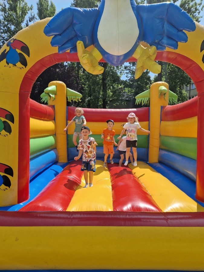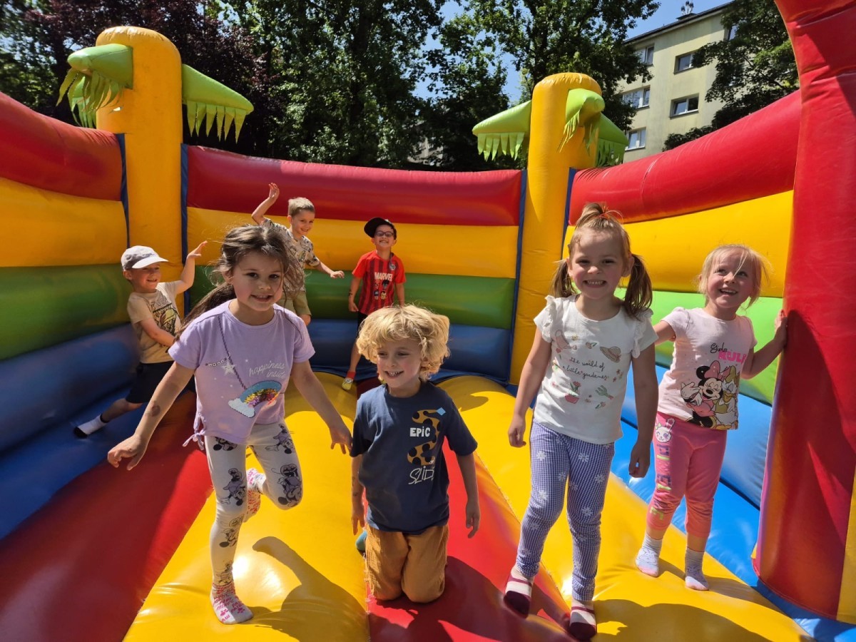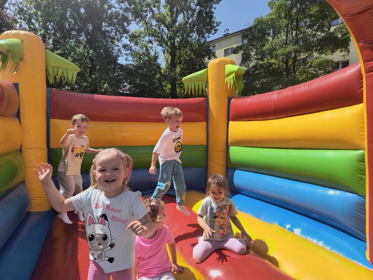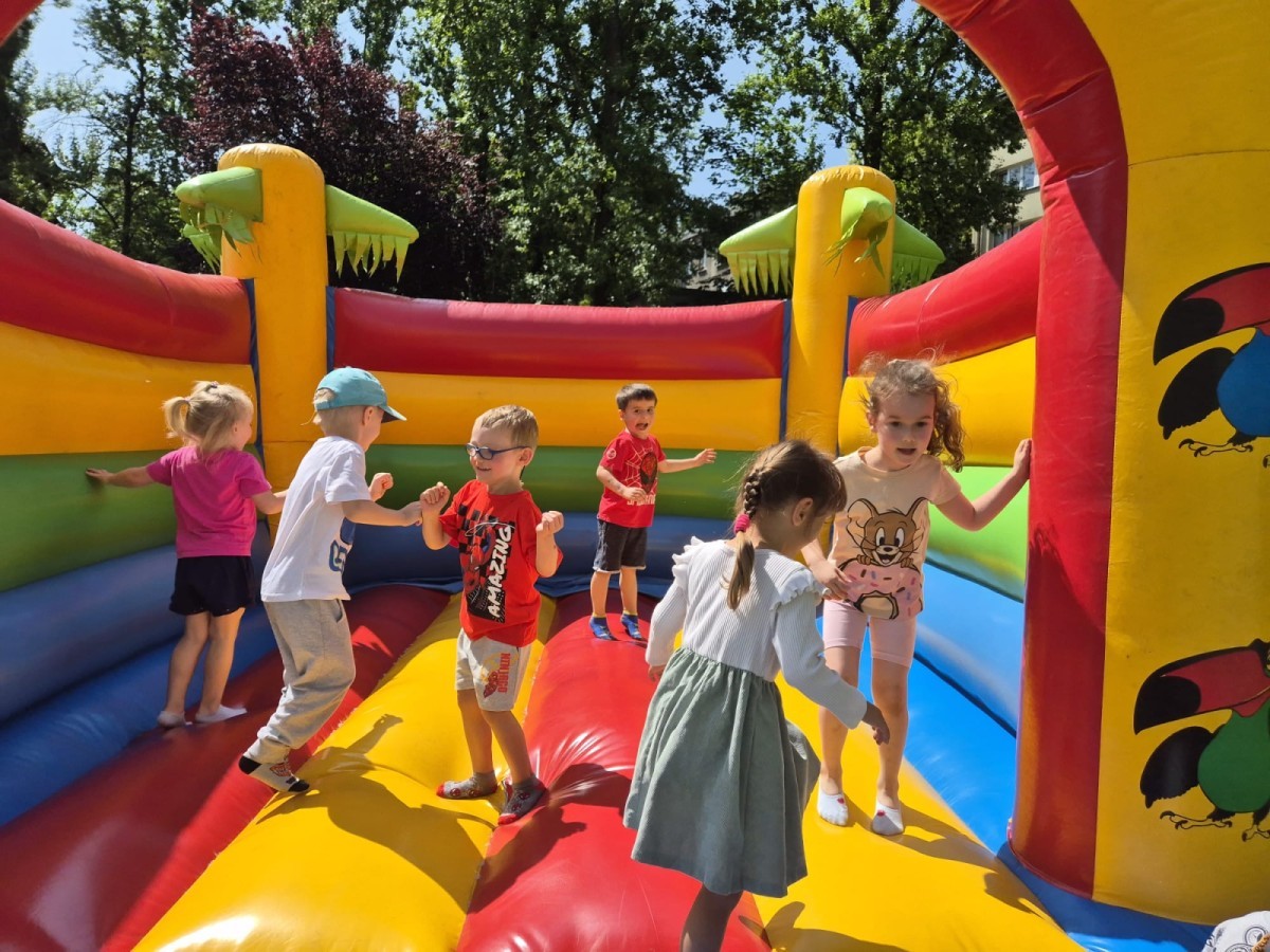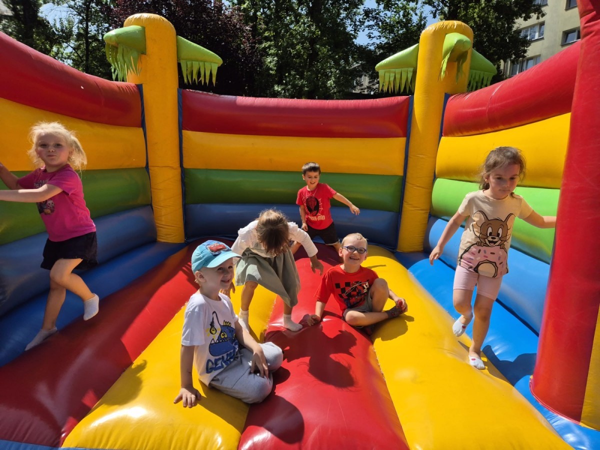 Dzieci z radością skakały aż pod same chmury, a śmiechom i okrzykom radości nie było końca. Wszyscy świetnie się bawili, a kolorowy dmuchaniec stał się centrum zabawy przez cały dzień. To był naprawdę wesoły i pełen energii czas dla wszystkich przedszkolaków.