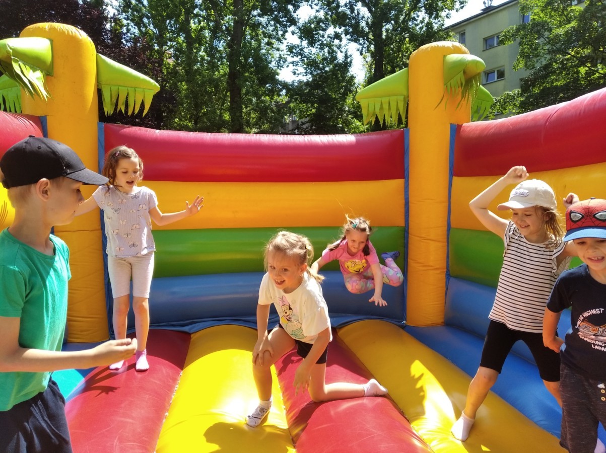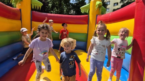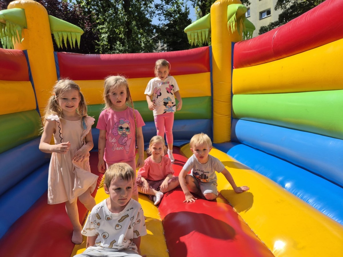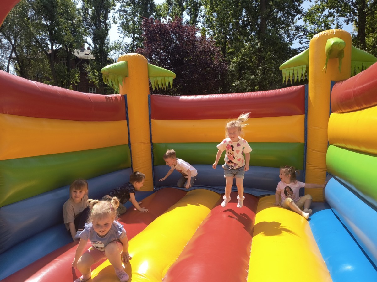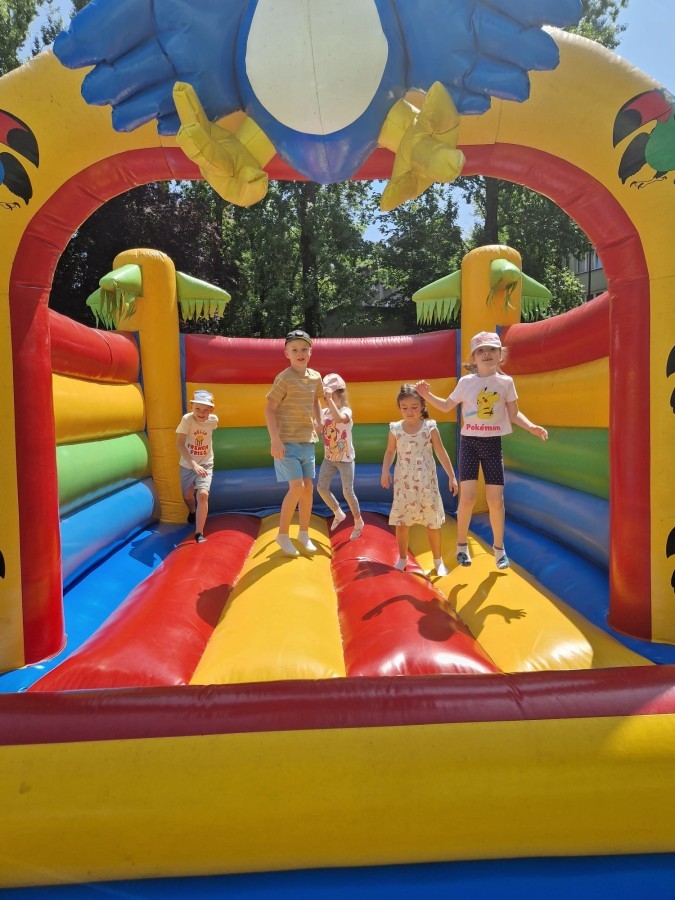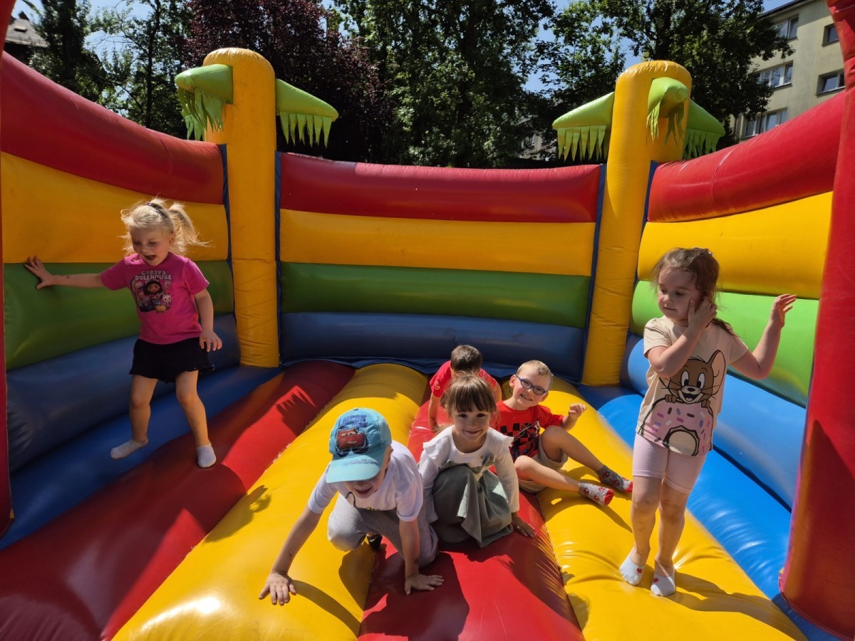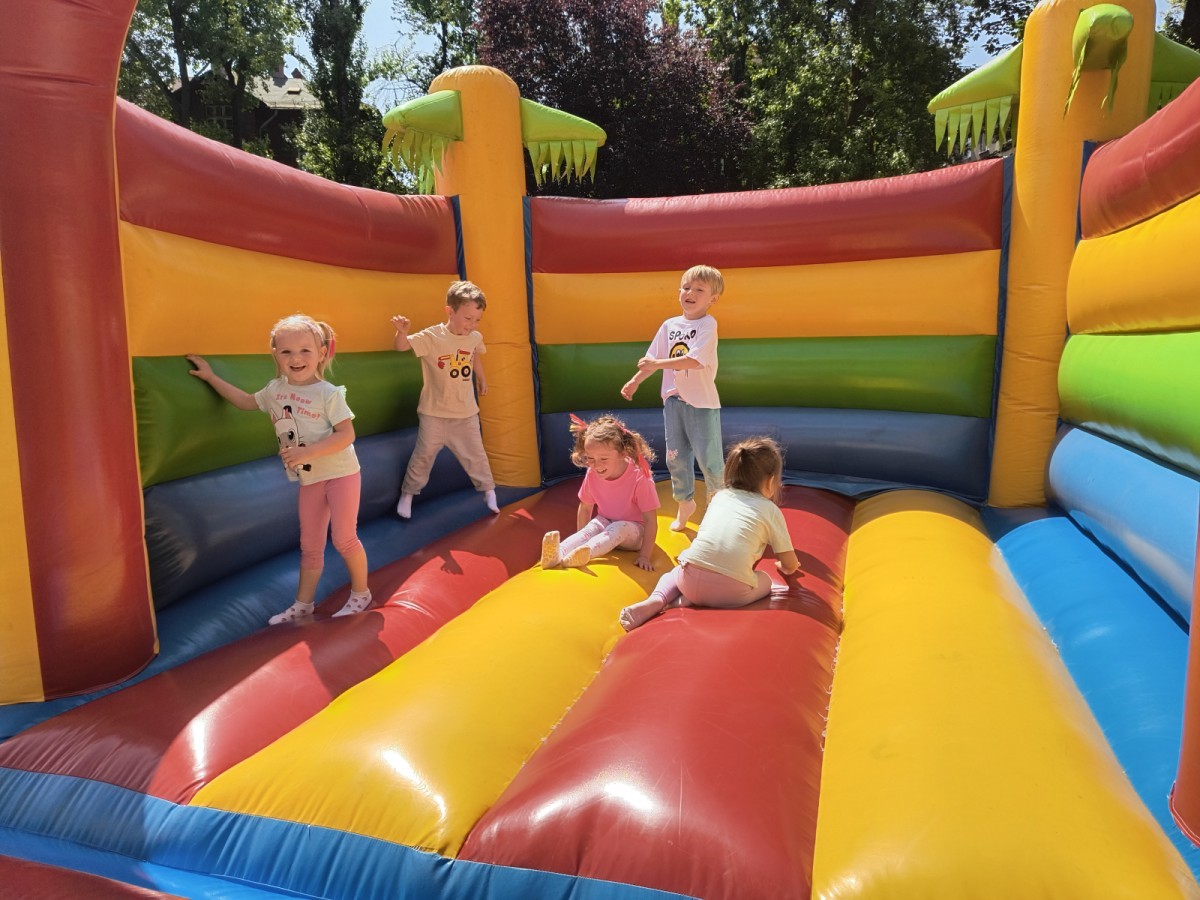 Dzieci z radością skakały aż pod same chmury, a śmiechom i okrzykom radości nie było końca. Wszyscy świetnie się bawili, a kolorowy dmuchaniec stał się centrum zabawy przez cały dzień. To był naprawdę wesoły i pełen energii czas dla wszystkich przedszkolaków.