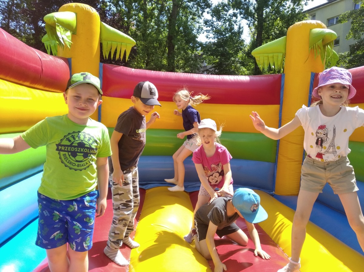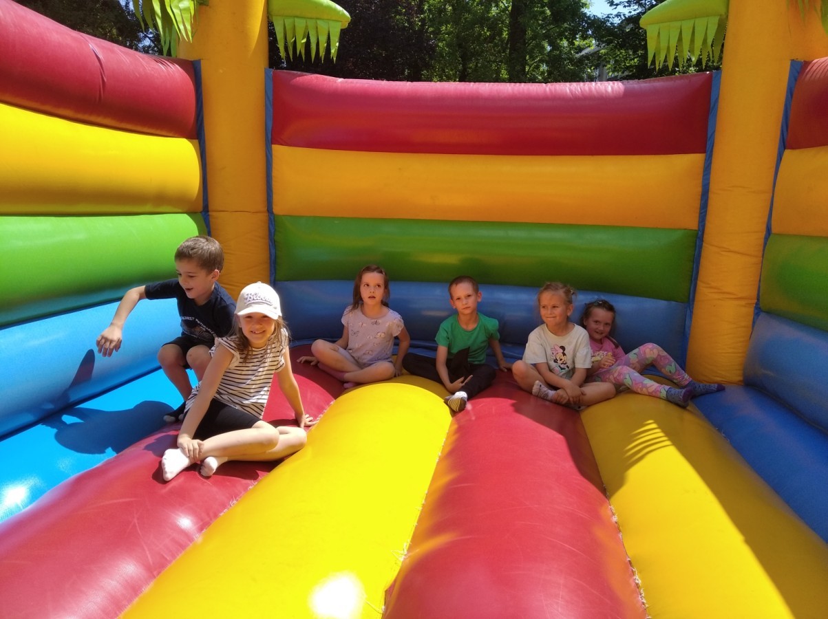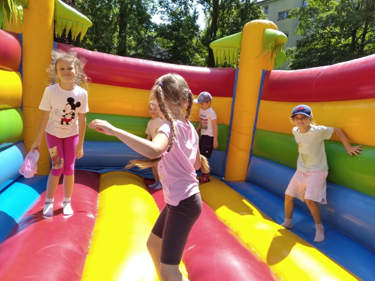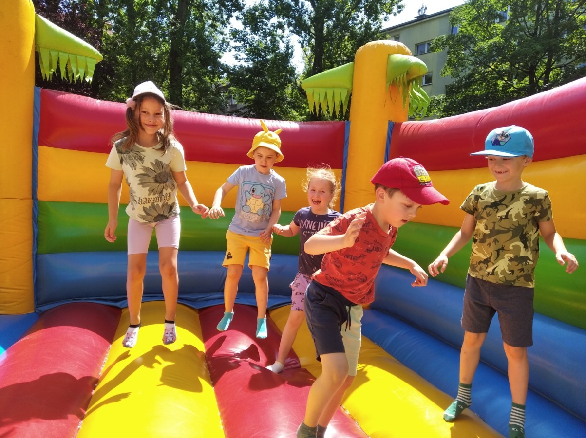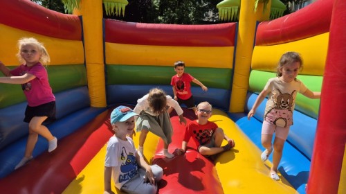 Dzieci z radością skakały aż pod same chmury, a śmiechom i okrzykom radości nie było końca. Wszyscy świetnie się bawili, a kolorowy dmuchaniec stał się centrum zabawy przez cały dzień. To był naprawdę wesoły i pełen energii czas dla wszystkich przedszkolaków.