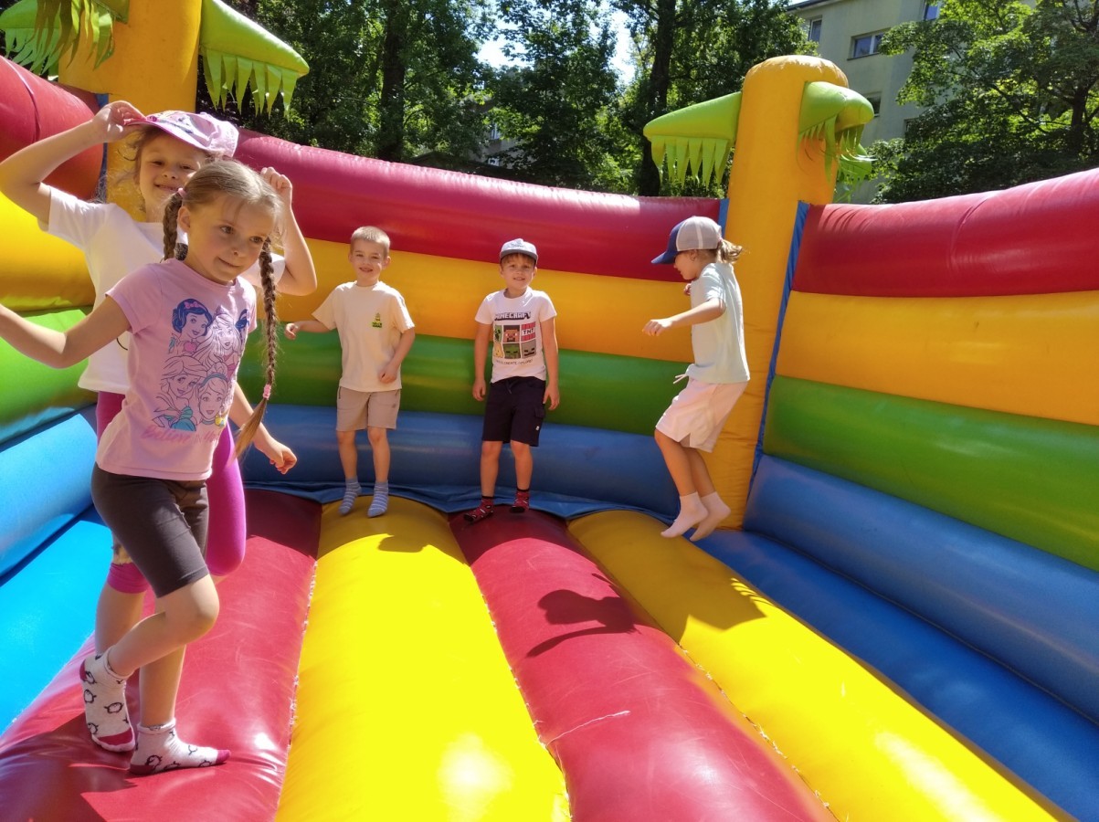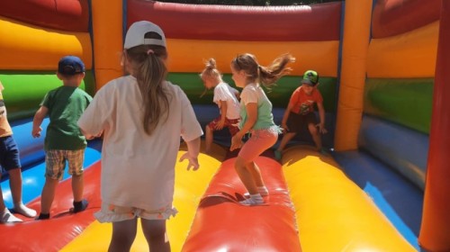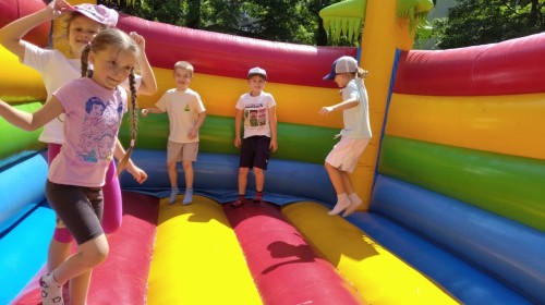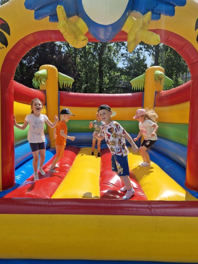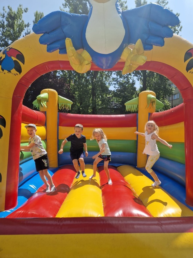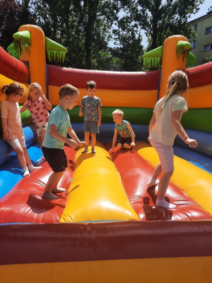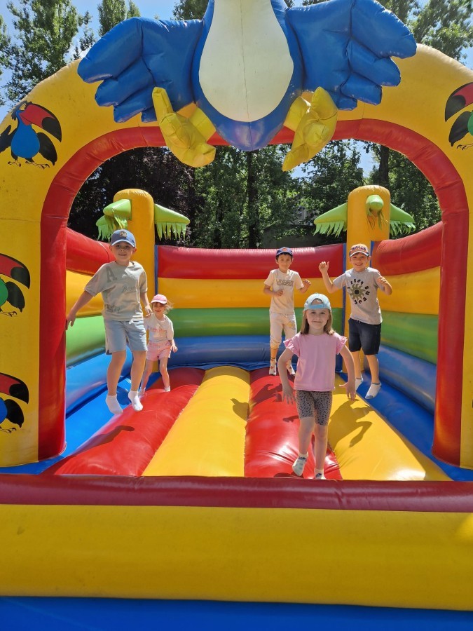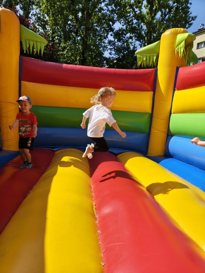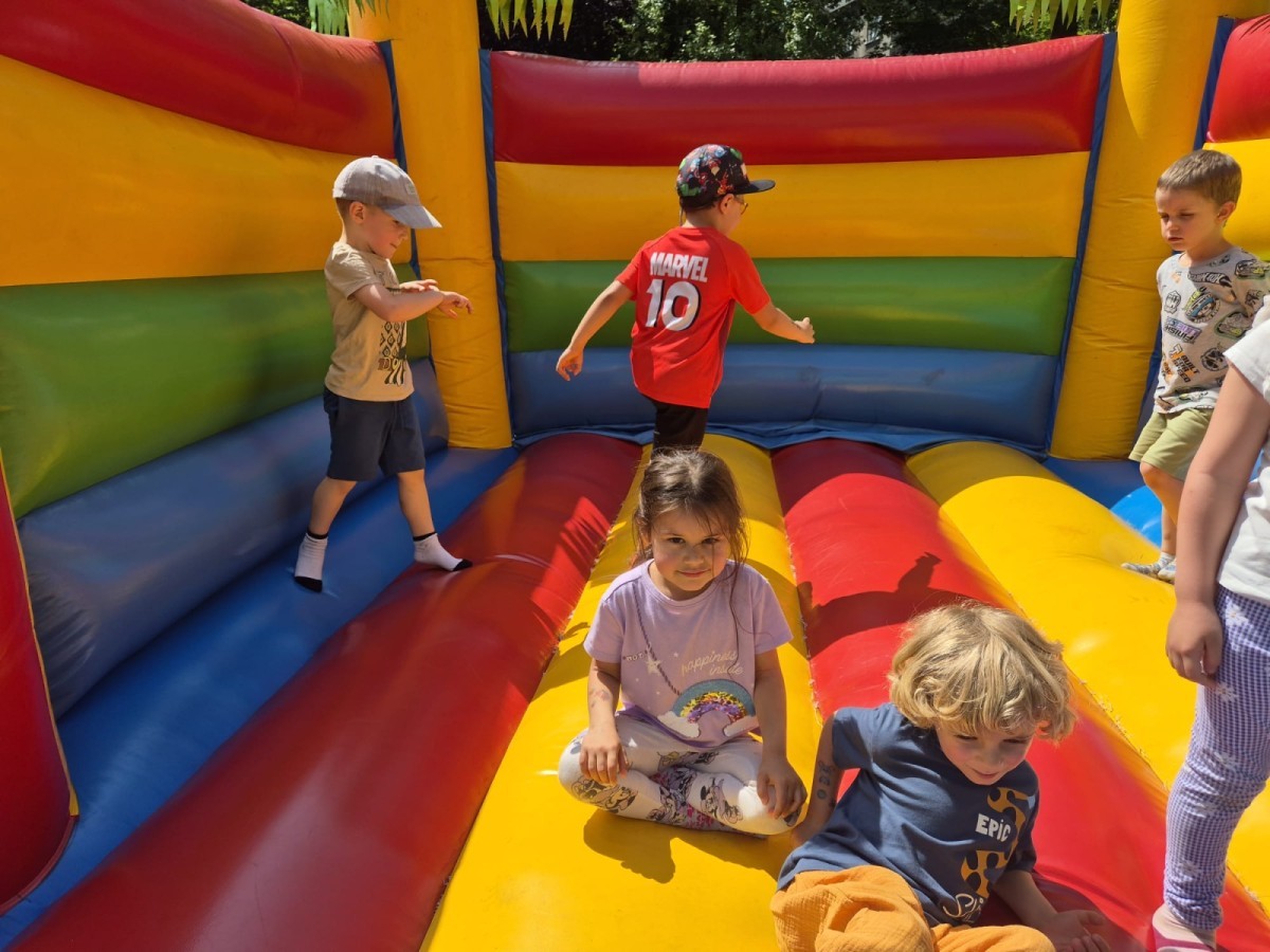 Dzieci z radością skakały aż pod same chmury, a śmiechom i okrzykom radości nie było końca. Wszyscy świetnie się bawili, a kolorowy dmuchaniec stał się centrum zabawy przez cały dzień. To był naprawdę wesoły i pełen energii czas dla wszystkich przedszkolaków.
