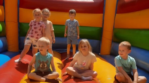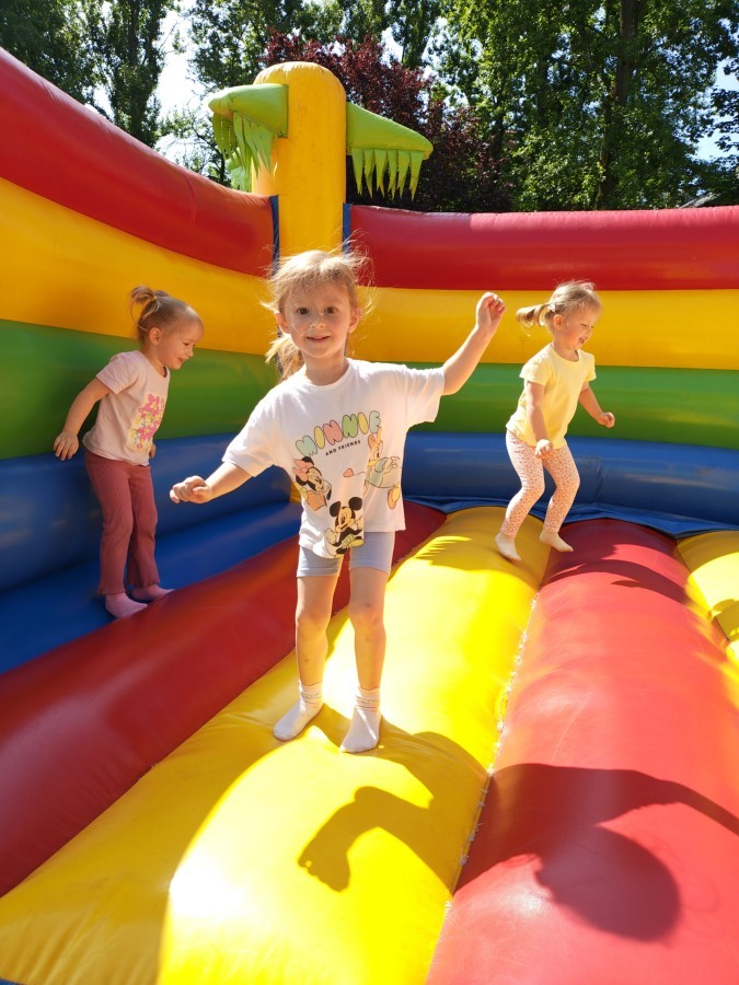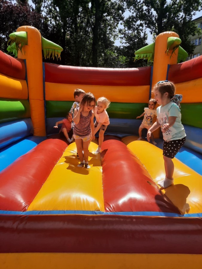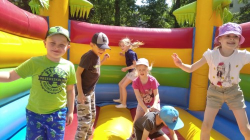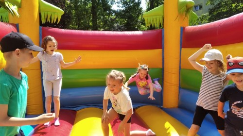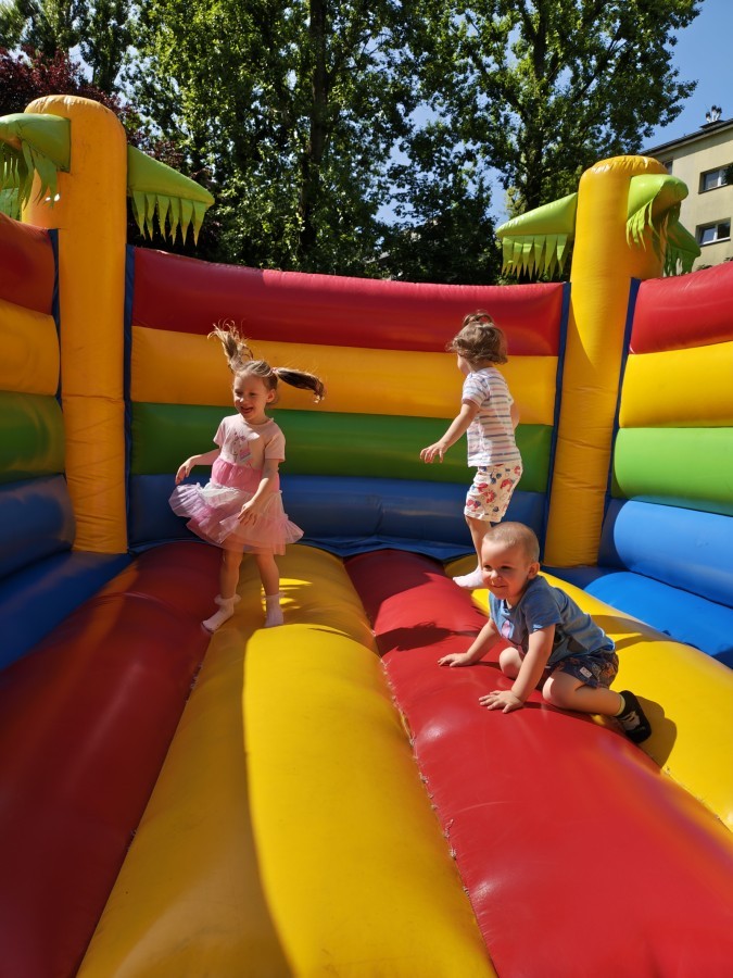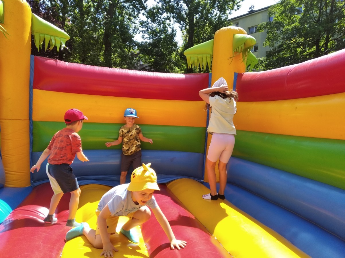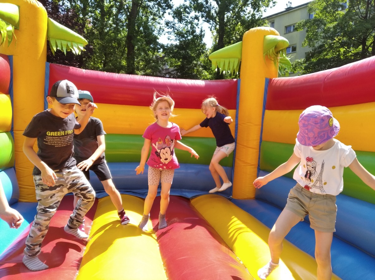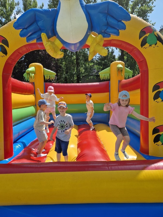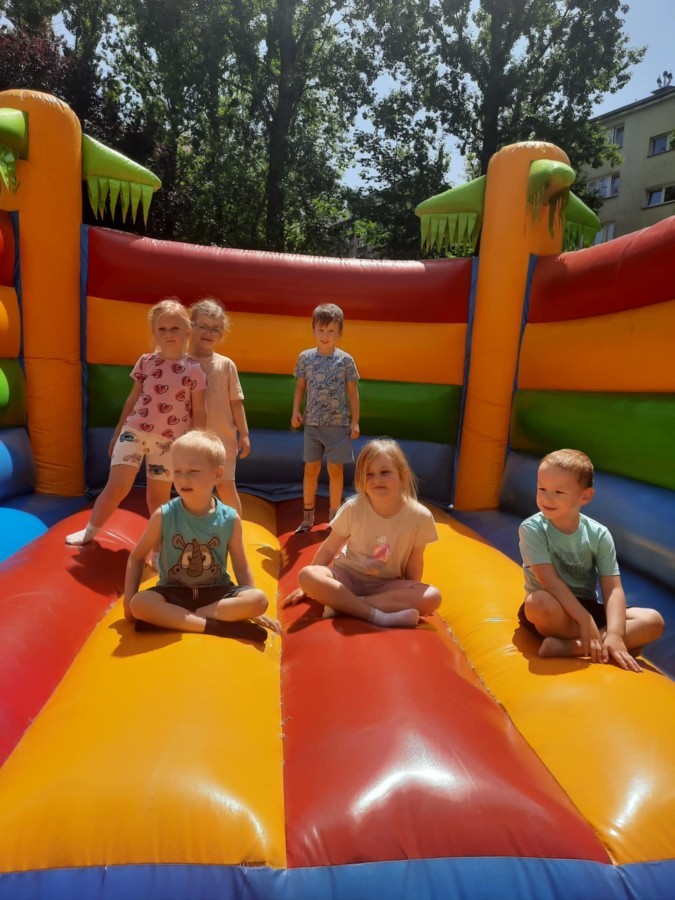Dzieci z radością skakały aż pod same chmury, a śmiechom i okrzykom radości nie było końca. Wszyscy świetnie się bawili, a kolorowy dmuchaniec stał się centrum zabawy przez cały dzień. To był naprawdę wesoły i pełen energii czas dla wszystkich przedszkolaków.
