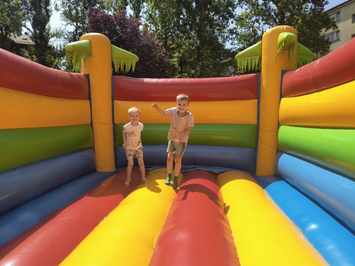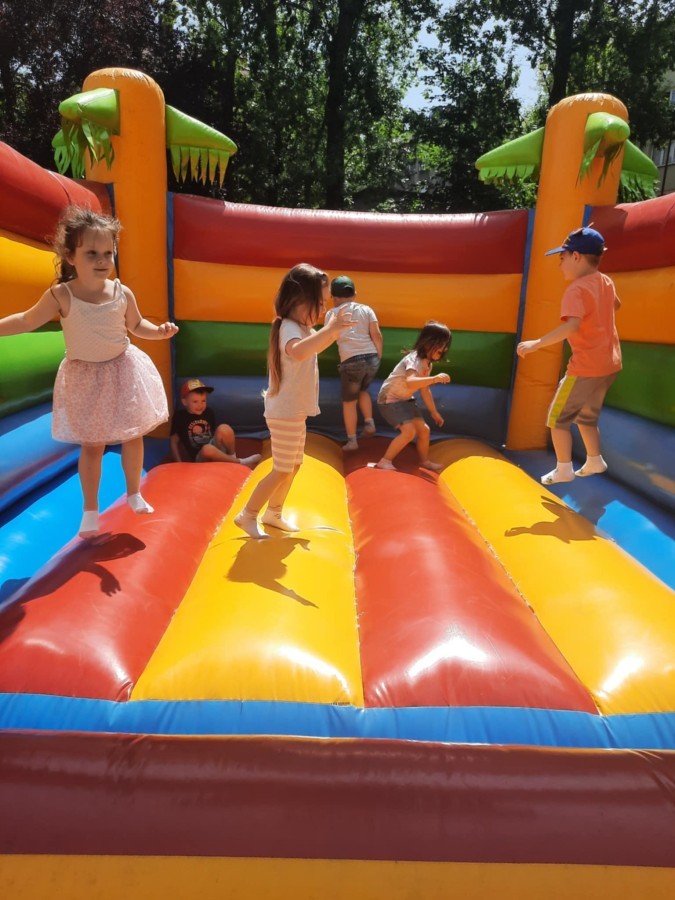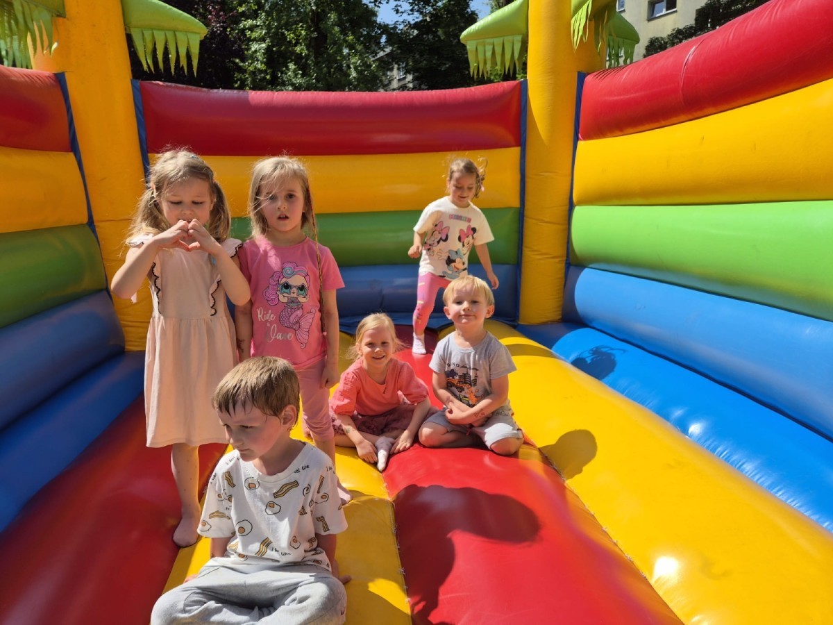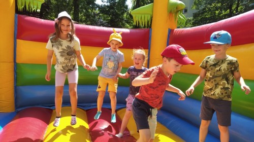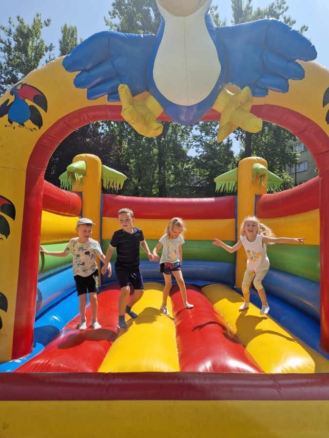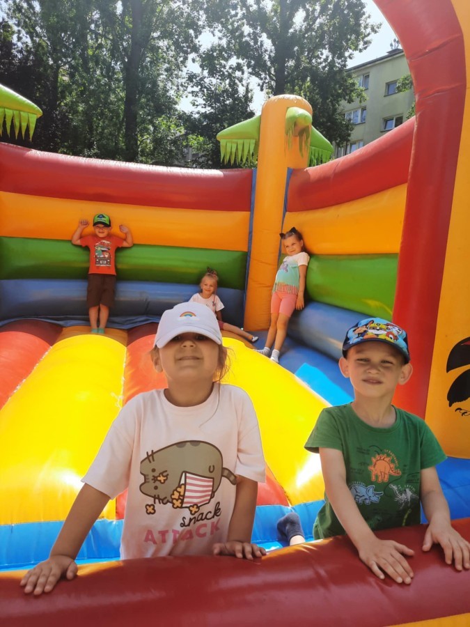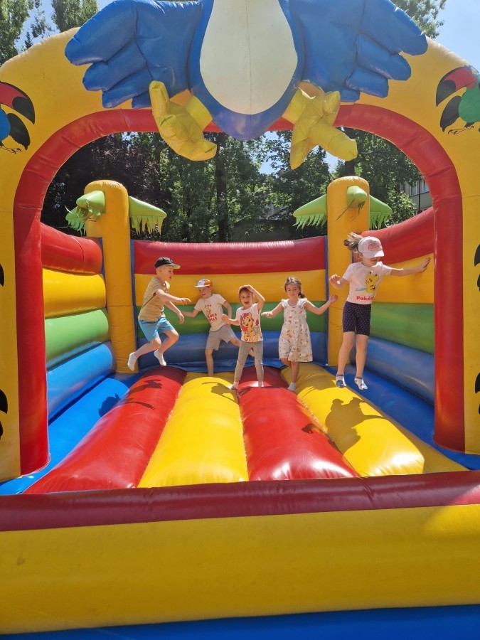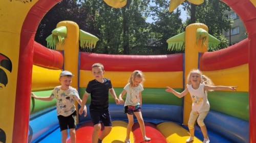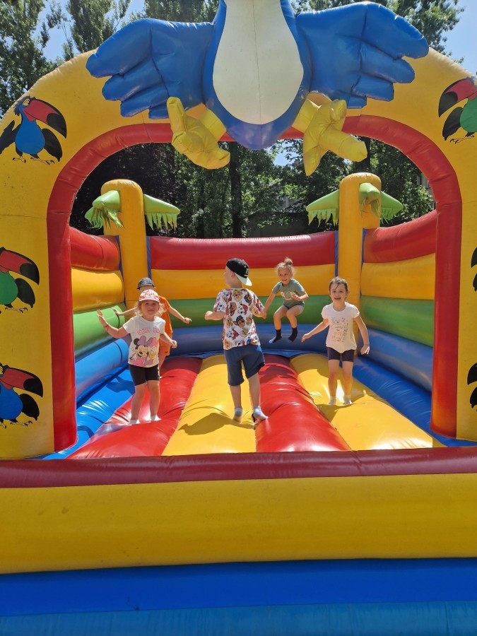 Dzieci z radością skakały aż pod same chmury, a śmiechom i okrzykom radości nie było końca. Wszyscy świetnie się bawili, a kolorowy dmuchaniec stał się centrum zabawy przez cały dzień. To był naprawdę wesoły i pełen energii czas dla wszystkich przedszkolaków.