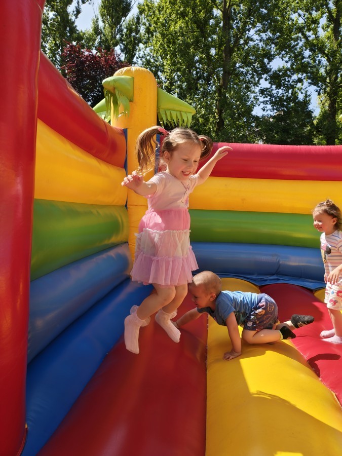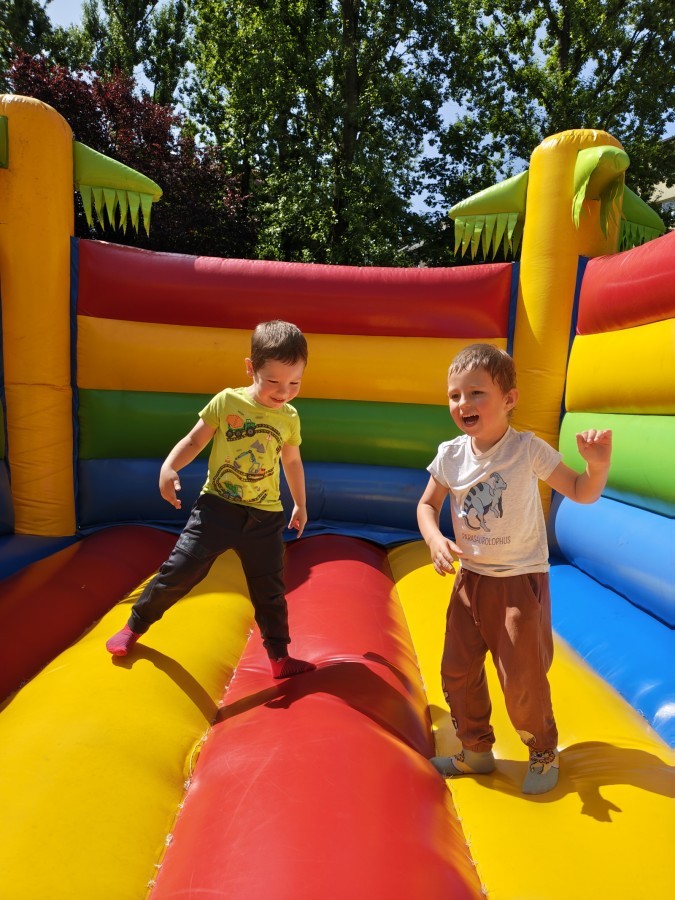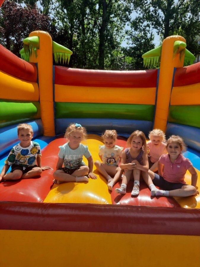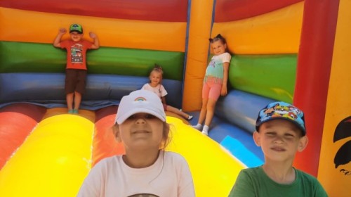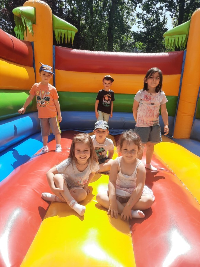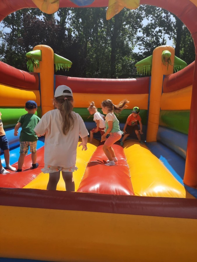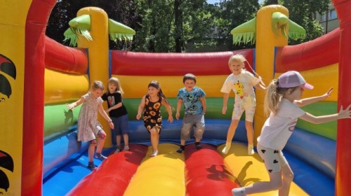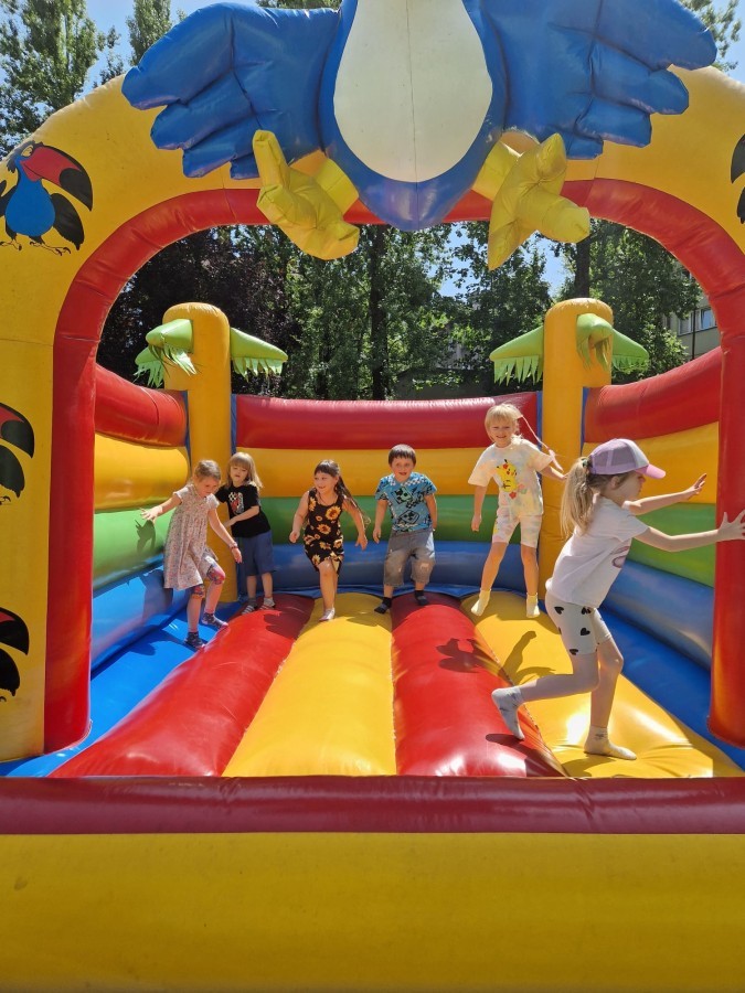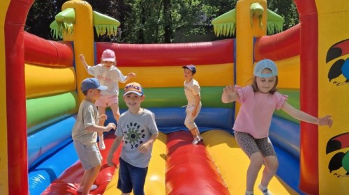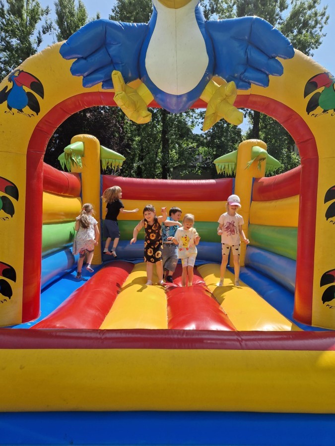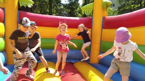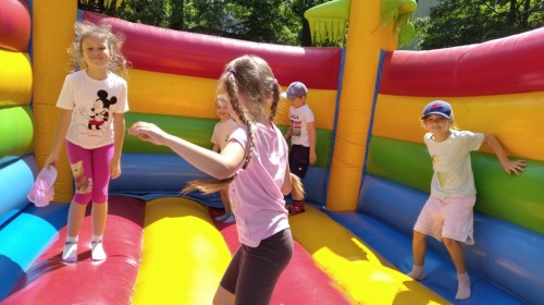Dzieci z radością skakały aż pod same chmury, a śmiechom i okrzykom radości nie było końca. Wszyscy świetnie się bawili, a kolorowy dmuchaniec stał się centrum zabawy przez cały dzień. To był naprawdę wesoły i pełen energii czas dla wszystkich przedszkolaków.