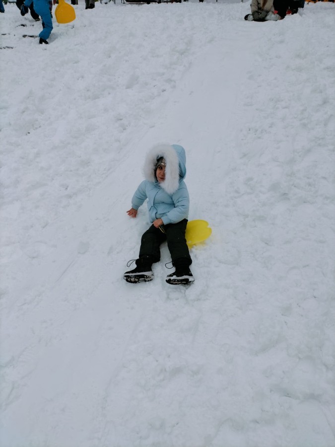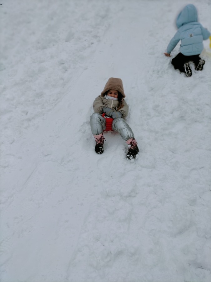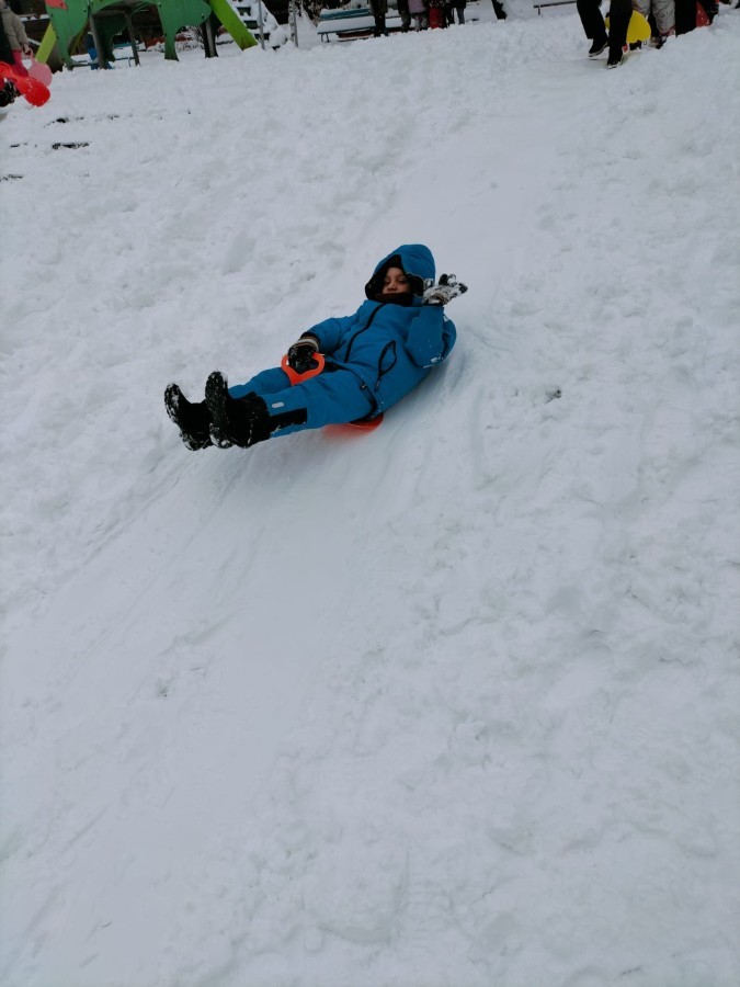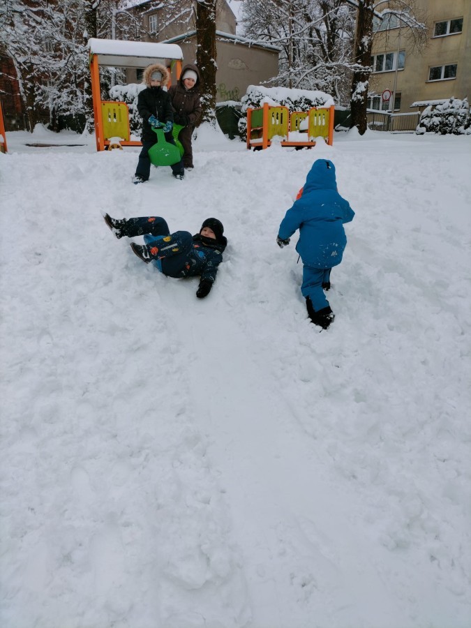 Dzieci z ogromnym entuzjazmem bawiły się na śniegu. Nie zabrakło również zjeżdżania na jabłuszkach. Śmiech i okrzyki radości towarzyszyły każdemu zjazdowi. Dzieci ćwiczyły równowagę, koordynację oraz przede wszystkim świetnie się bawiły.