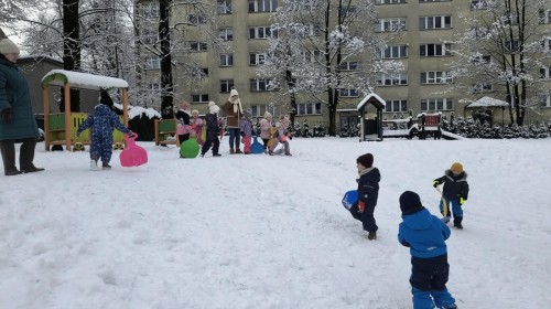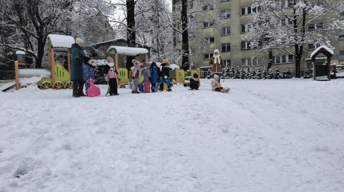 Ostatnie dni przyniosły nam prawdziwie zimową aurę, dlatego grupa „Muchomorki” z radością wykorzystała śnieżną pogodę na wspólne zabawy na świeżym powietrzu.