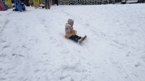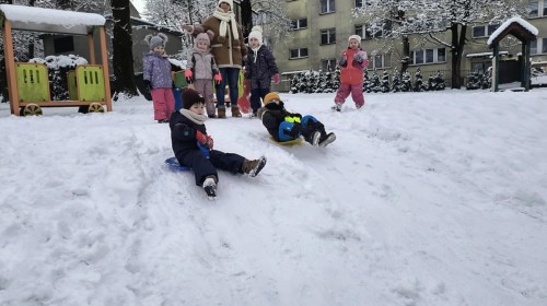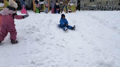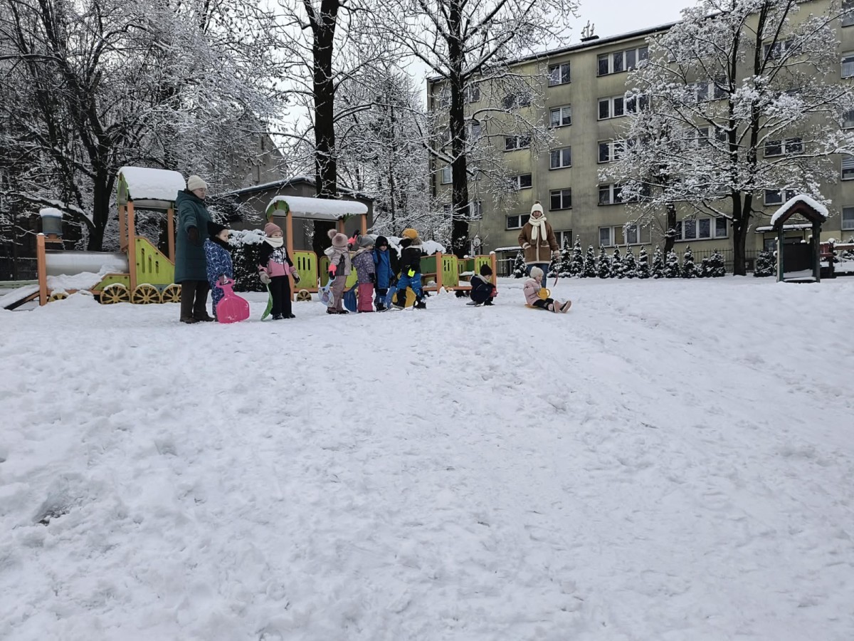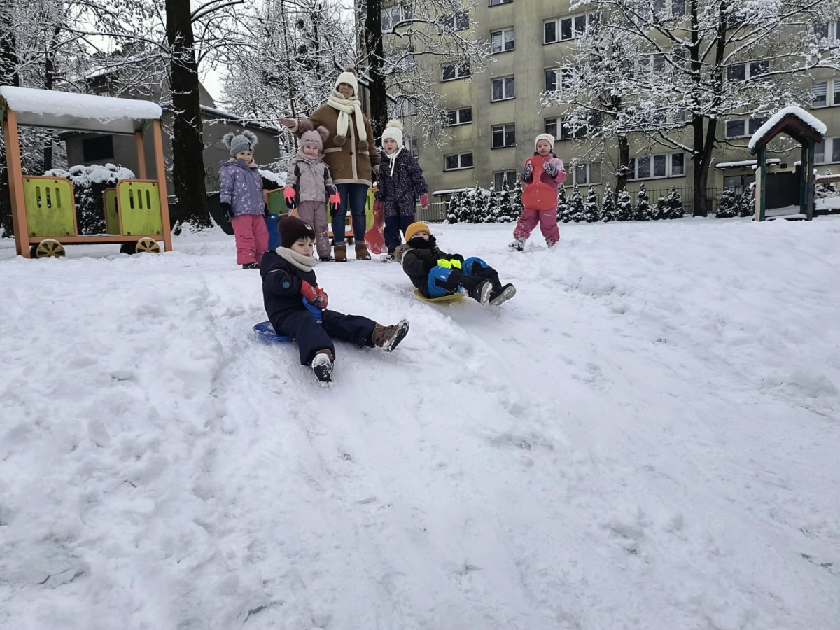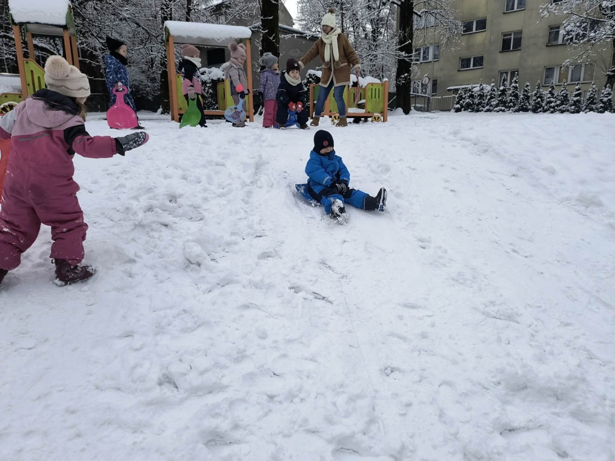 Dzieci z ogromnym entuzjazmem korzystały z uroków zimy. Nie zabrakło zjeżdżania na jabłuszkach oraz radosnych zabaw na śniegu. Śmiech i okrzyki zachwytu towarzyszyły każdemu zjazdowi. Przedszkolaki ćwiczyły równowagę, koordynację ruchową, a przede wszystkim świetnie się bawiły.